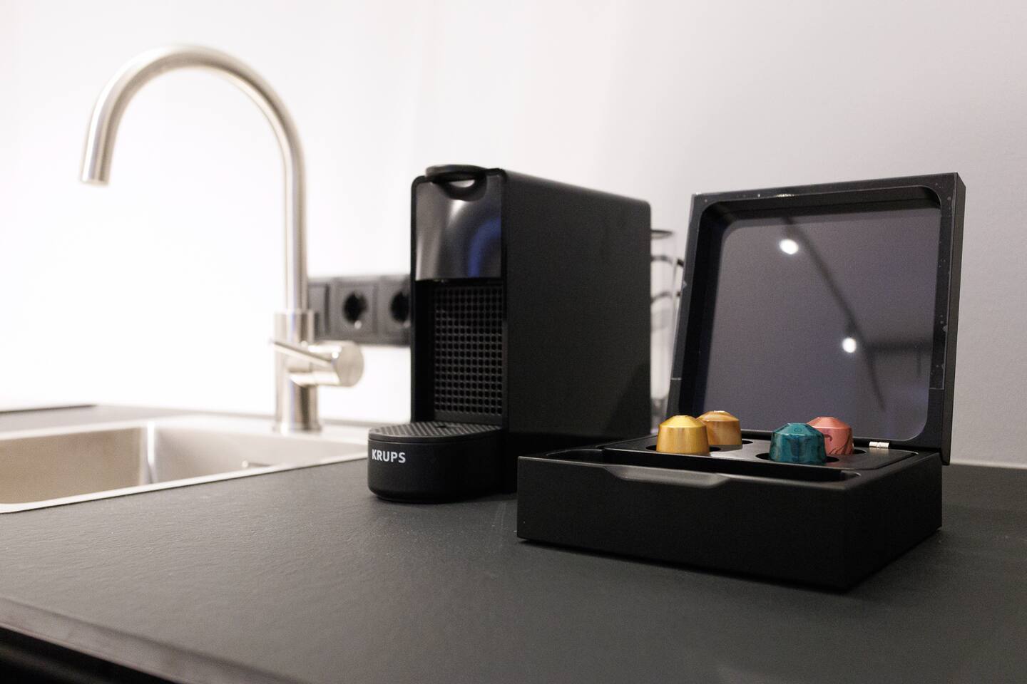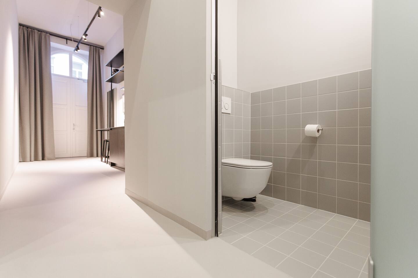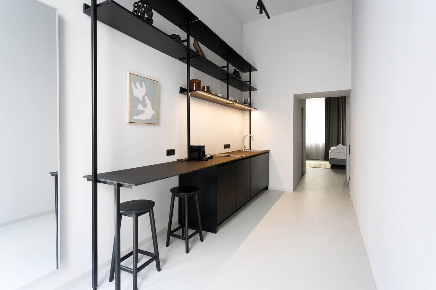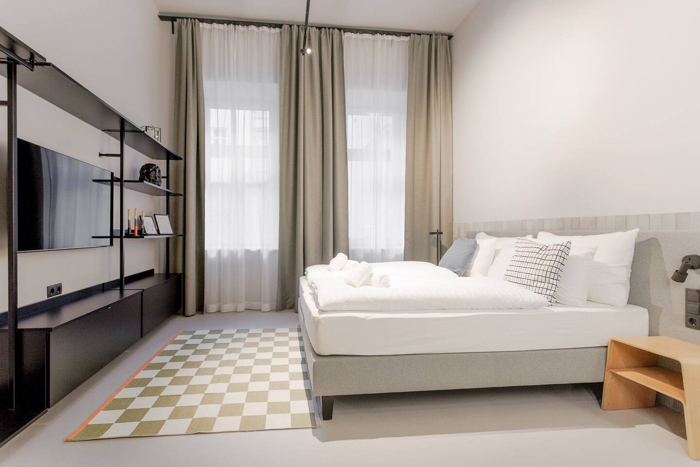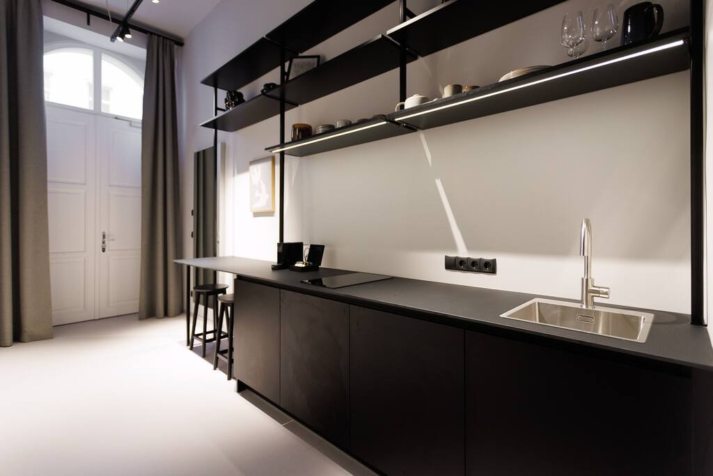 Your studio is a modern, clean and stylish space designed with a minimalist approach. It features high ceilings, large street-facing windows, a fully equipped kitchenette, underfloor heating, air conditioning, and a comfortable king-size bed (180×200). You’ll also find fast WiFi, a 50” Samsung QLED Smart TV, blackout shades, hotel-style slippers, a Nespresso machine, kettle, microwave, stovetop, mini-fridge with freezer, and basic cooking essentials.