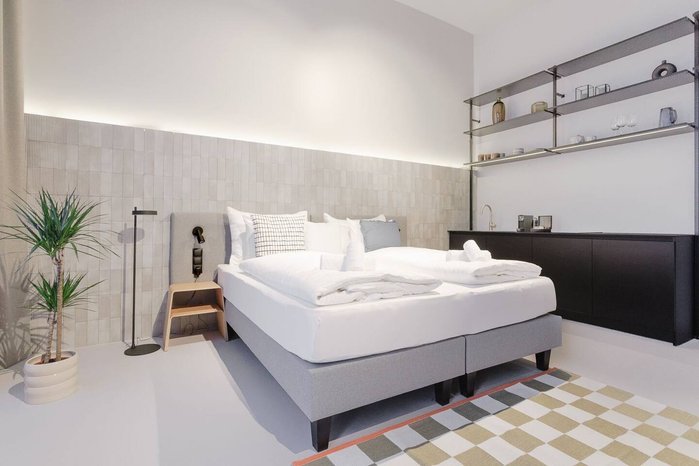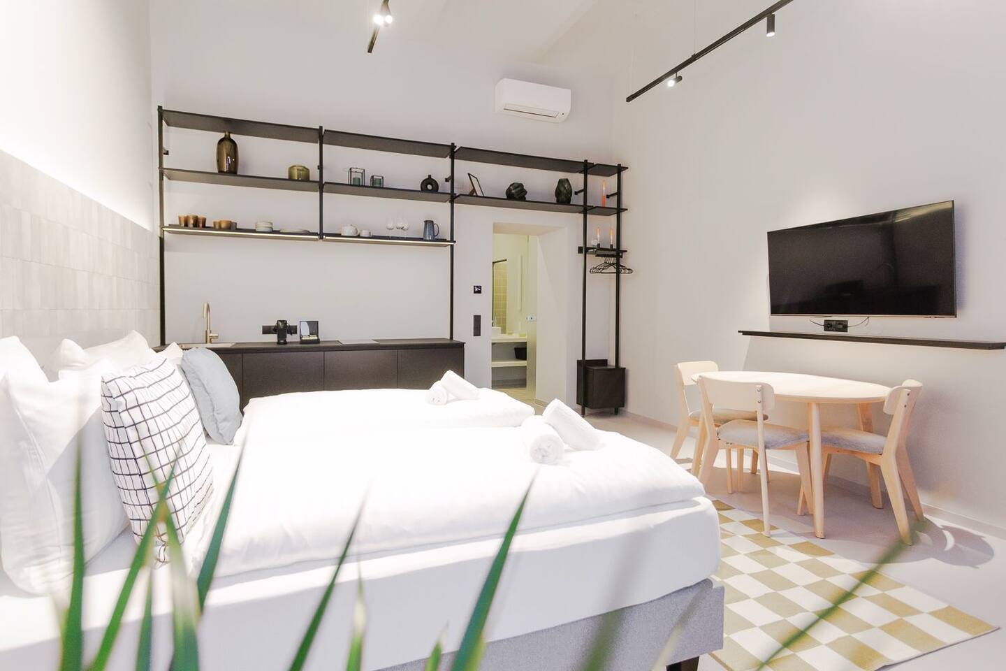 Your studio is a modern, clean, and stylish space with a minimalist design and high ceilings that create an airy, elegant feel. It features large street-facing windows, underfloor heating, air conditioning, and a comfortable king-size bed (180×200). The kitchenette includes a Nespresso machine, kettle, microwave, stovetop, mini-fridge with freezer compartment, basic cooking essentials, and a dishwasher for added convenience. You’ll also enjoy fast WiFi, a 50” Samsung QLED Smart TV, blackout shades, and hotel-style slippers for a comfortable stay.